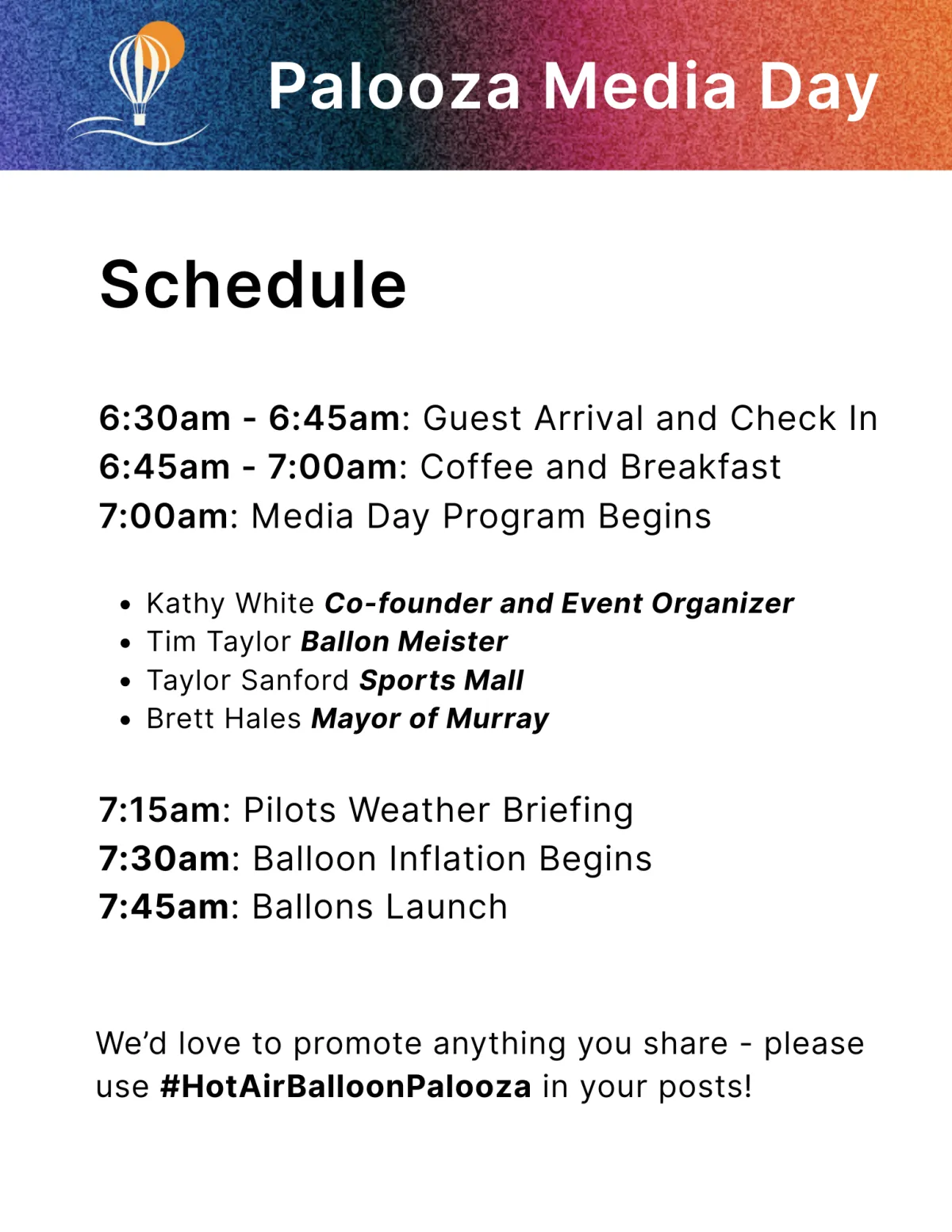 The Utah Hot Air Balloon Palooza welcomes members of the press, influencers, bloggers, and content creators to our exclusive Media Day Preview. This will be a rare, behind-the-scenes peek of one of Utah’s most colorful and anticipated balloon festivals and will give you the best access and content before the event opens to the public.